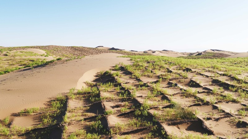項目設(shè)置不同材料的沙障,栽植多種沙生植物,并建立沙漠治理效果監(jiān)測體系,研究不同沙障材料的耐久性,不同沙生植物的保存率,以及其在防沙治沙領(lǐng)域的防護(hù)效果及經(jīng)濟性,評估后期有無次生危害。通過對不同類型沙障和沙生植物防沙治沙效能評價,篩選出適宜本地區(qū)效果良好的沙障和沙生植物?;趯Y選出的沙障進(jìn)行機械化布設(shè),研發(fā)設(shè)計先進(jìn)的適用于沙漠環(huán)境的固沙裝備,形成標(biāo)準(zhǔn)化生產(chǎn)車間及生產(chǎn)線。利用研制出的固沙裝備布設(shè)篩選出的沙障,栽植篩選出的沙生植物,研究出一種全新的防沙治沙技術(shù),建立一套完整的防沙治沙新模式,進(jìn)行試驗示范并推廣應(yīng)用。