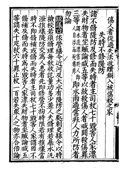 清嘉慶年間版《唐律疏議》書(shū)影,這一頁(yè)展示的是對(duì)“失時(shí)不修堤防”的懲處措施。