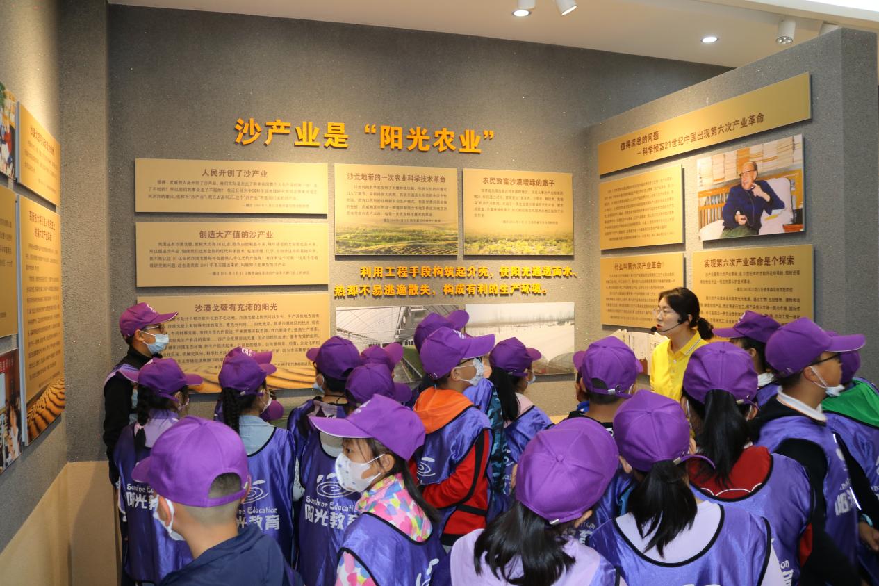 在沙產(chǎn)業(yè)展廳,孩子們駐足聆聽錢學(xué)森和宋平關(guān)于沙產(chǎn)業(yè)的概念以及發(fā)展歷程以及他們?yōu)榉郎持紊乘龅呢暙I和努力。