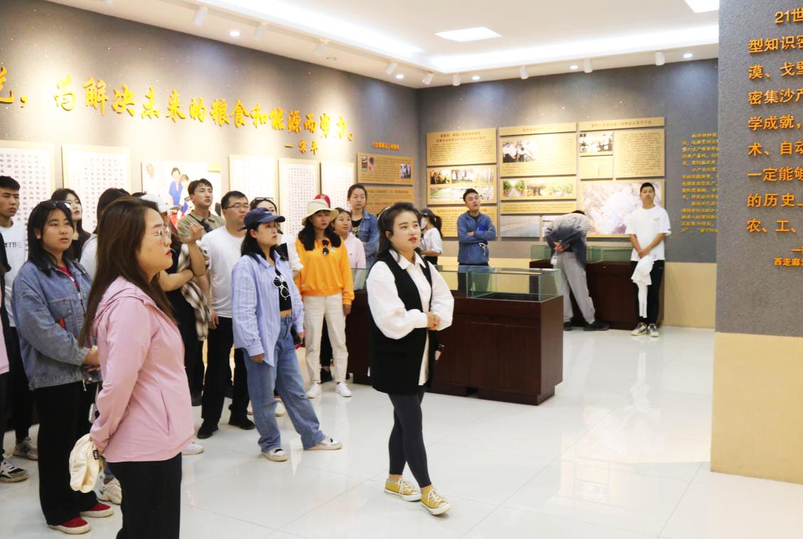 在沙產業(yè)展廳,團建成員們了解了錢學森和宋平關于沙產業(yè)的概念、發(fā)展歷程以及他們?yōu)榉郎持紊乘龅呢暙I和努力,并實地觀看了固沙車機械化鋪設草方格的演示,進一步了解了沙漠的由來和危害,懂得了治沙的意義與目的。