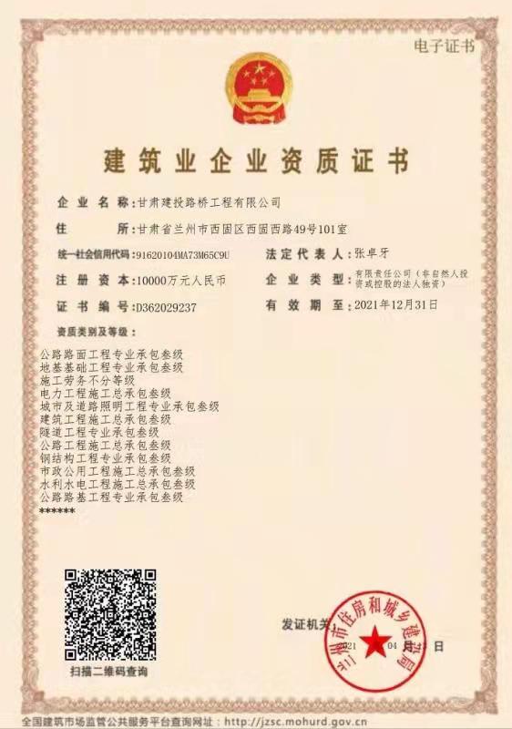 建筑業(yè)企業(yè)資質(zhì)證書(公路路面工程專業(yè)承包叁級(jí)、地基基礎(chǔ)工程專業(yè)承包叁級(jí)、施工勞務(wù)不分等級(jí)、電力工程施工總承包叁級(jí)、城市及道路照明工程專業(yè)承包叁級(jí)、建筑工程施工總承包叁級(jí)、隧道工程專業(yè)承包叁級(jí)、公路工程施工總承包叁級(jí)、鋼結(jié)構(gòu)工程專業(yè)承包叁級(jí)、市政公用工程施工總承包叁級(jí)、水利水電工程施工總承包叁級(jí)、公路路基工程專業(yè)承包叁級(jí)))